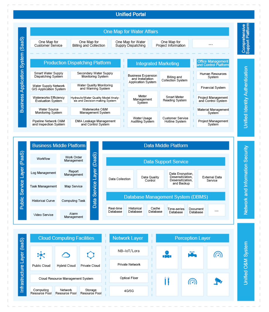 Smart water construction products and services cover urban water supply systems from "source to tap", including water sources, water plants, pipelines, and secondary water supply. Leveraging technologies such as cloud platforms, big data, and IoT, it integrates water application subsystems including SCADA, GIS, DMA, water quality monitoring, billing, secondary water supply systems, pump station monitoring, security video, production automation, water application, customer service systems, asset management, and OA. This eliminates information silos and data chimneys, achieves data sharing, establishes a collaborative operation management model, reduces accident risks and enterprise operational costs, and supports corporate decision-making.